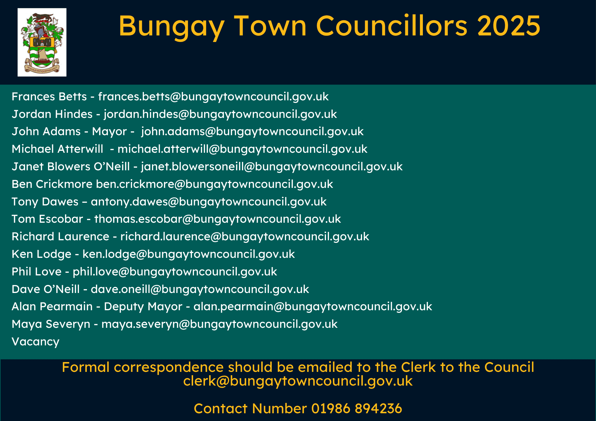 Bungay Town Council has 15 locally elected or co-opted Councillors who serve for a four year term. All Councillors are required to comply with the Code Of Conduct and register their interests. The Town Councillors are volunteers and receive no payment for their work.